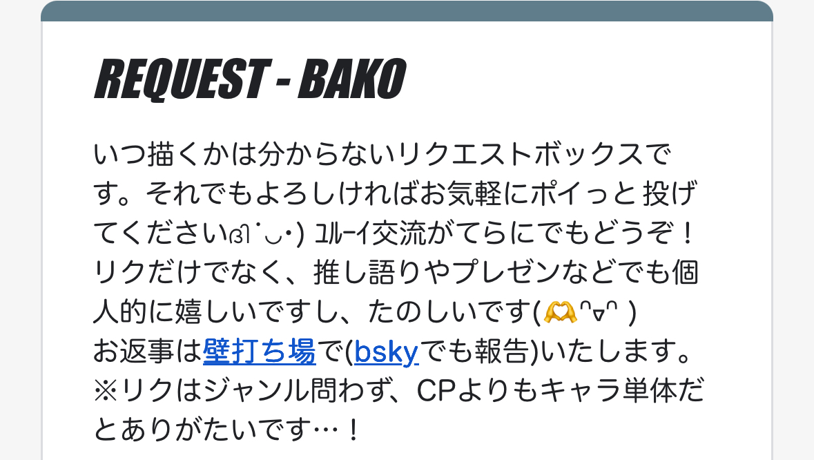 リクエストはもちろん、推し語りやプレゼンなどもジャンル問わず、お気軽にポイポイ投げていただけたら嬉しいです!